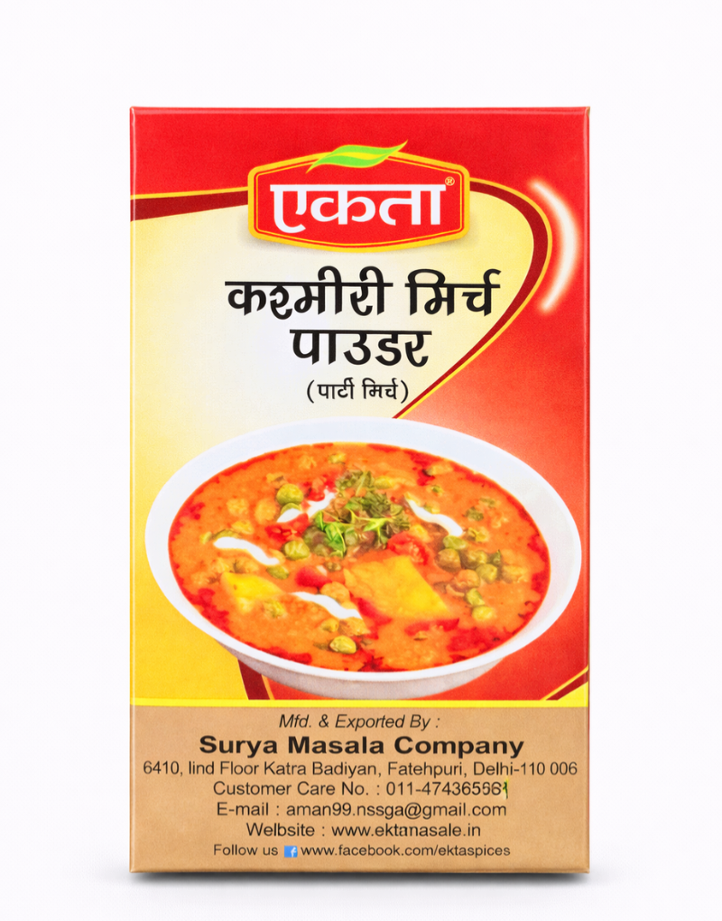 Add vibrant color and rich flavor to your dishes with Ekta Masale Kashmiri Mirch Powder (Party Mirch). Made from carefully selected Kashmiri chillies, this spice offers a mild heat while delivering a deep red color that enhances the visual appeal of your food.