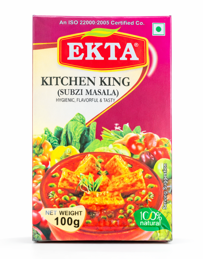 Ekta Masale Kitchen King Masala is a premium all-purpose spice blend specially crafted for vegetable dishes. It combines a variety of aromatic spices to deliver rich taste, vibrant color, and irresistible aroma to your daily cooking.
