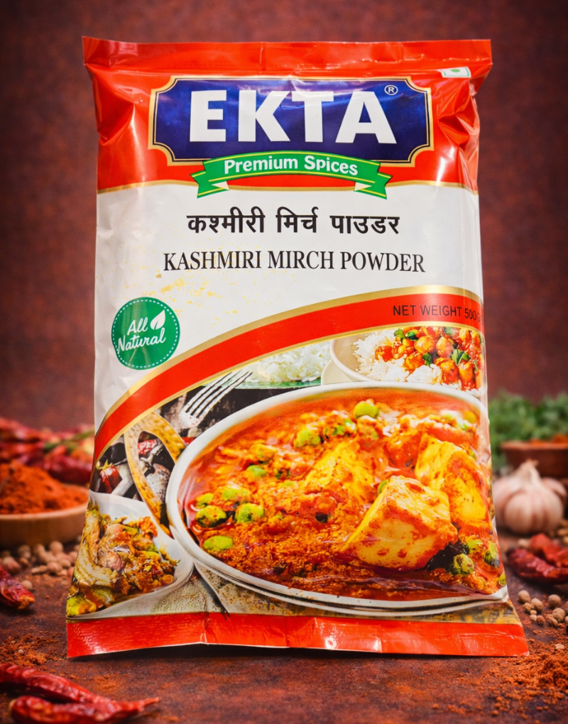 Ekta Premium Kashmiri Mirch Powder is a high-quality spice known for its bright red color and mild heat. Made from selected Kashmiri chilies, it enhances the appearance and flavor of your dishes without making them overly spicy.