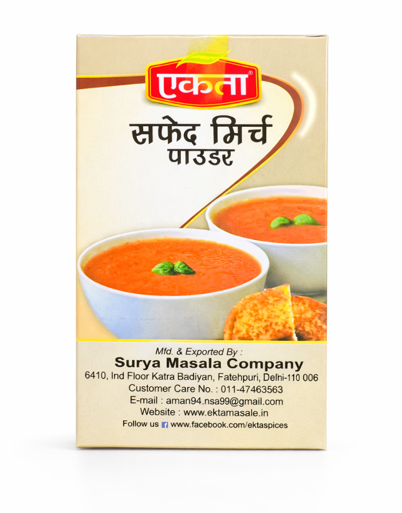 Hygienically processed and packed, Ekta White Pepper Powder maintains freshness, aroma, and purity, making it an essential ingredient for modern kitchens.